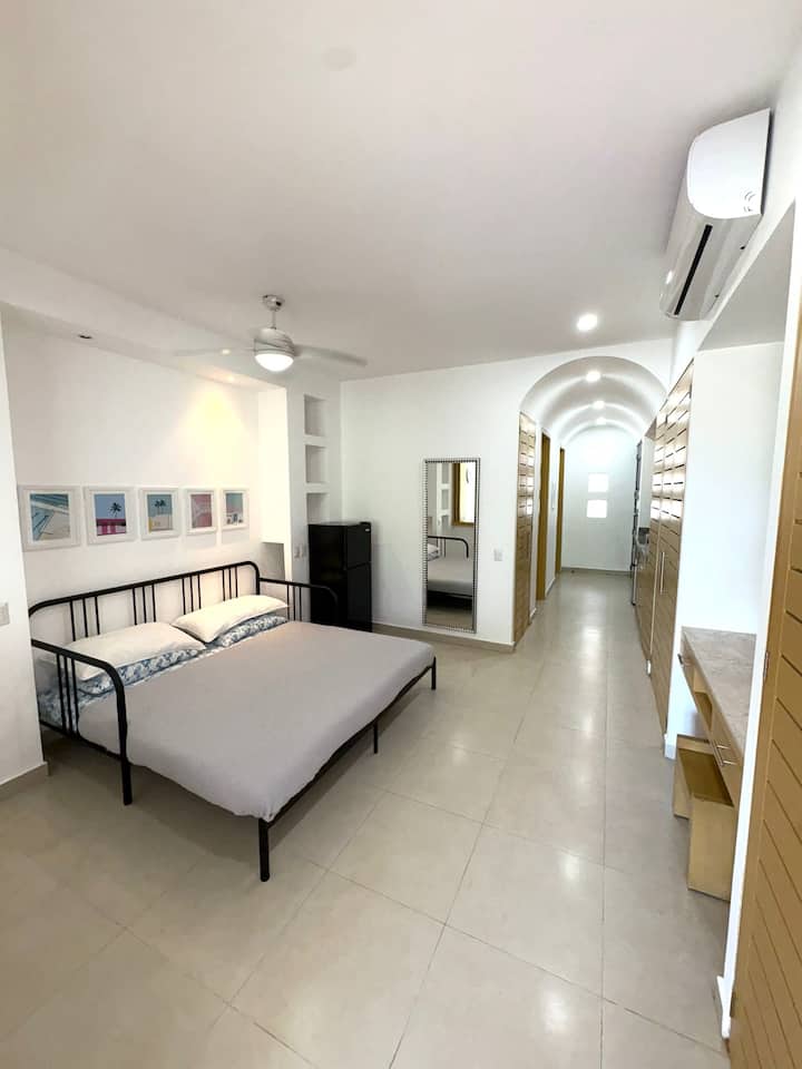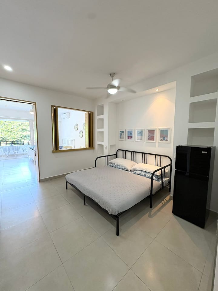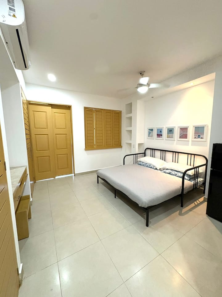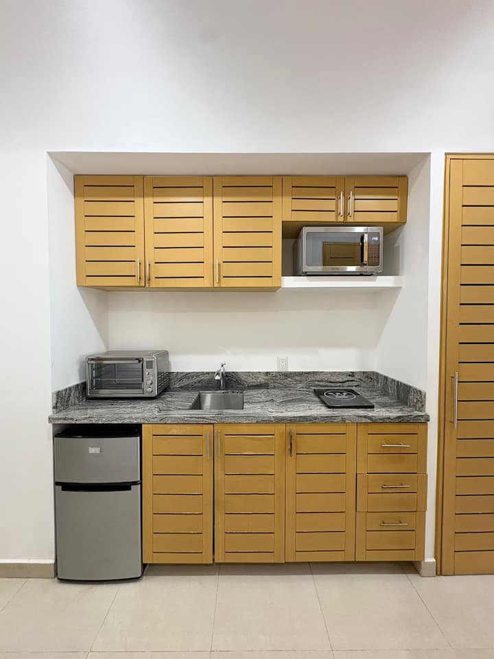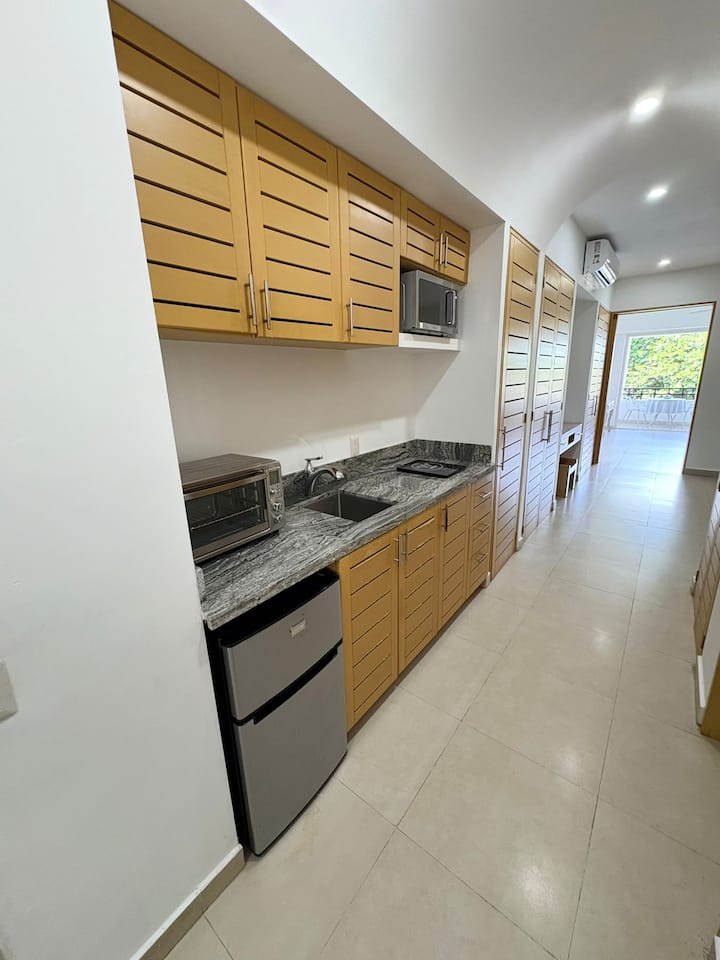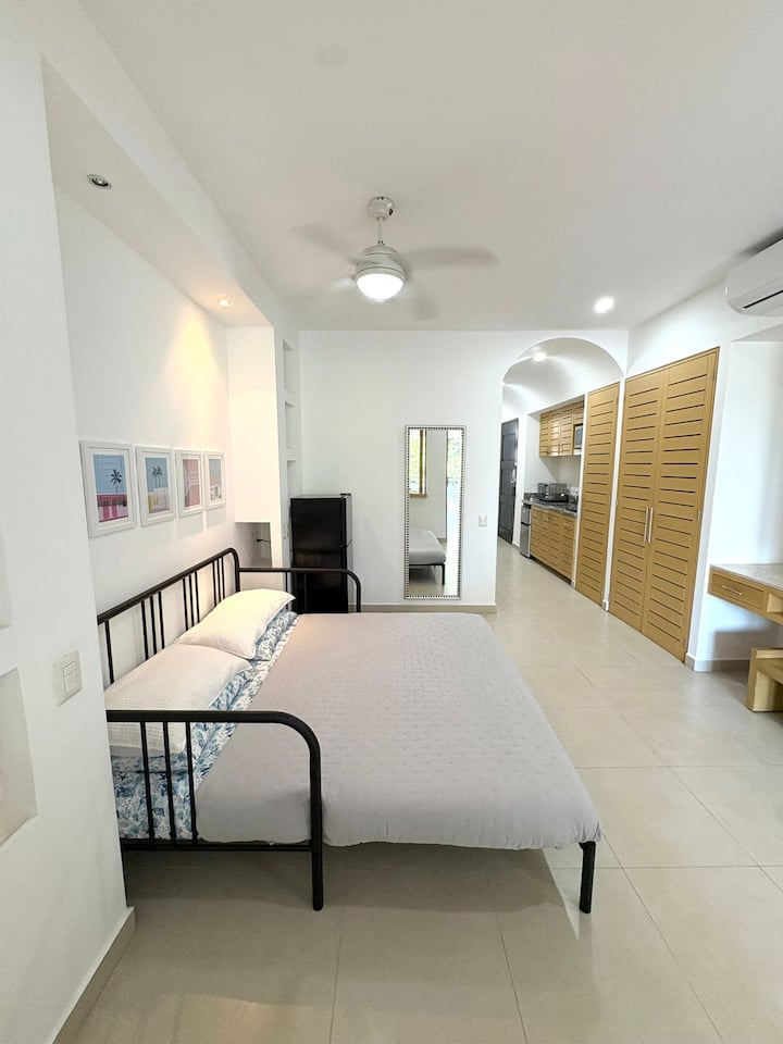 Sleeps 2 adults and 2 kids comfortably. King bed with a balcony view and Roku internet TV, additional king daybed that converts to a sofa for daytime use. Kitchen includes 2 fridges, Mini oven and air frier, induction cooktop, microwave, coffee maker, and all the essentials. Cool off with two brand new mini-split A/C units, and unwind with a cool drink on the terrace. Stay connected with high-speed Wi-Fi internet provided by Total Play.